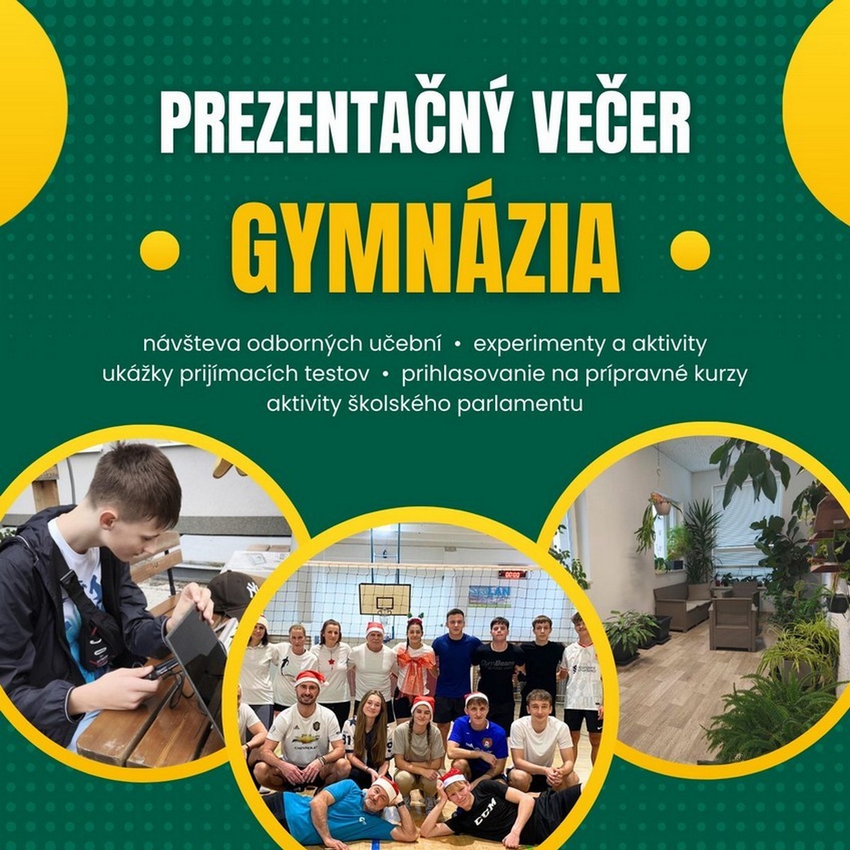 Súčasťou programu bude aj prezentácia Žiackeho parlamentu, ktorý predstaví bohaté mimoškolské aktivity a projektovú činnosť. Podujatie zároveň slúži ako miesto stretnutia pre bývalých žiakov, ktorí majú možnosť vrátiť sa do prostredia, kde strávili svoje študentské roky.